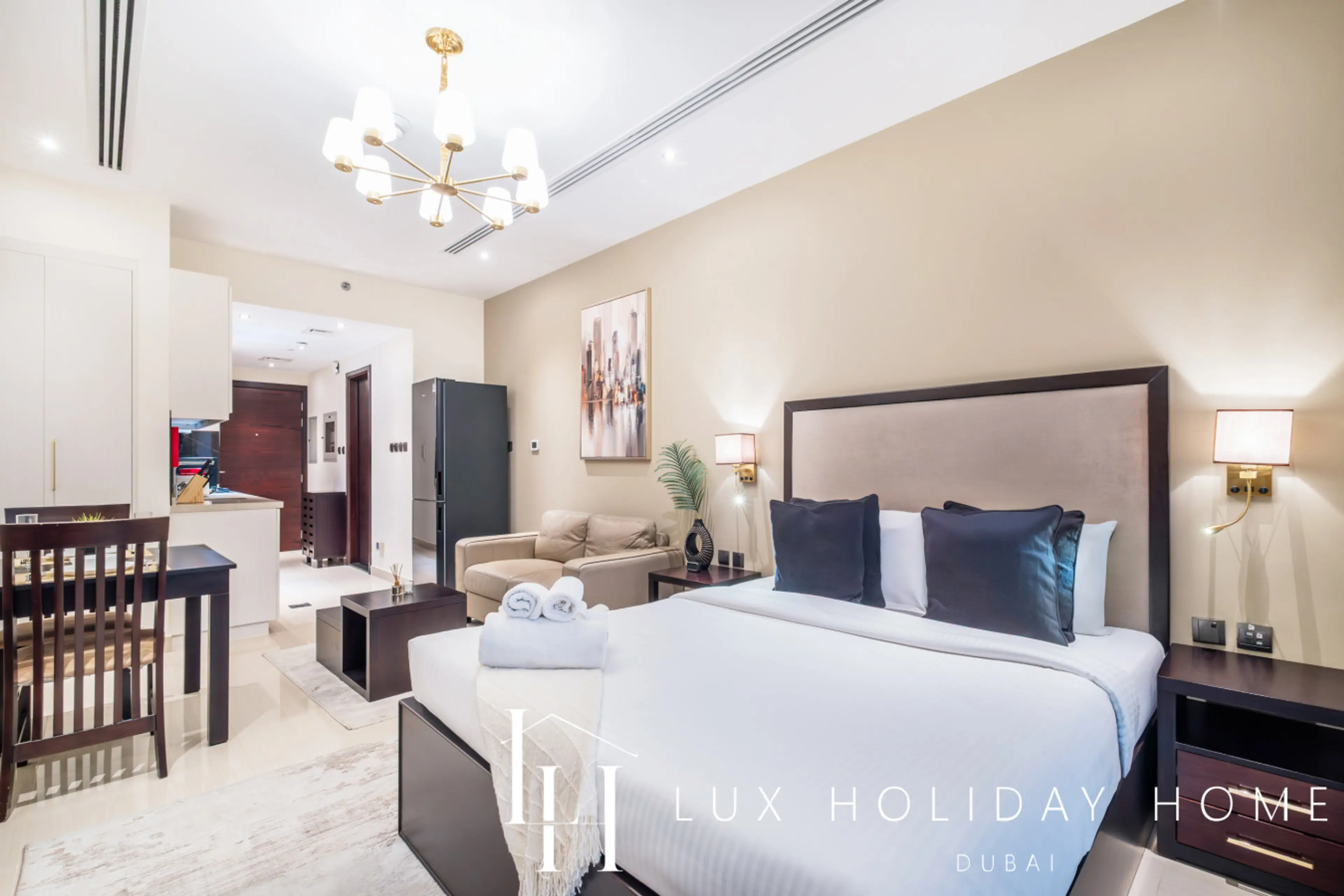 Welcome to LUX | The Burj Khalifa view Downtown Studio. Cozy Studio with Stunning Burj Khalifa Views ! Wake up to breathtaking sunset views and enjoy coffee on your private balcony. This fully furnished studio features a stylish living area with a Smart TV and a kitchen with high-end appliances. Ove...